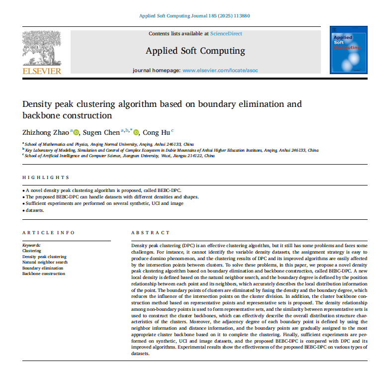 近日,英国正版365首页陈素根教授团队在国际学术期刊《Applied Soft Computing》上发表SCI论文“Density peak clustering algorithm based on boundary elimination and backbone construction”,该项研究工作与江南大学胡聪副教授合作完成。英国正版365首页研究生赵志忠为论文第一作者,陈素根教授为通讯作者,英国上市公司官网365为第一单位,该期刊影响因子IF=6.6,JCR一区,中科院二区TOP期刊。