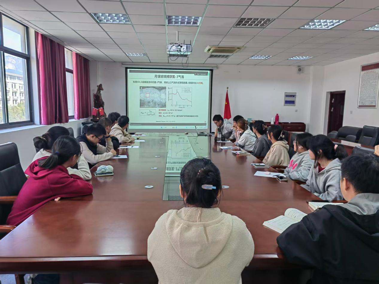许巍副研究员首先围绕月球探测的现状展开介绍,生动阐释了月壤研究的重要科学意义,并系统梳理了该领域的研究进展。他重点介绍了团队自主研制的国内首台高温核磁共振测试系统及其在月壤研究中的创新应用,同时指出月壤中蕴含的关键战略资源——水资源与氦3。基于对嫦娥五号月壤样品中氢、氦结构与动力学的深入研究,团队揭示了这两种资源在月壤中的主要赋存形式及其含量特征,并进一步提出了适用于月球原位开采水与氦3资源的新型方法。