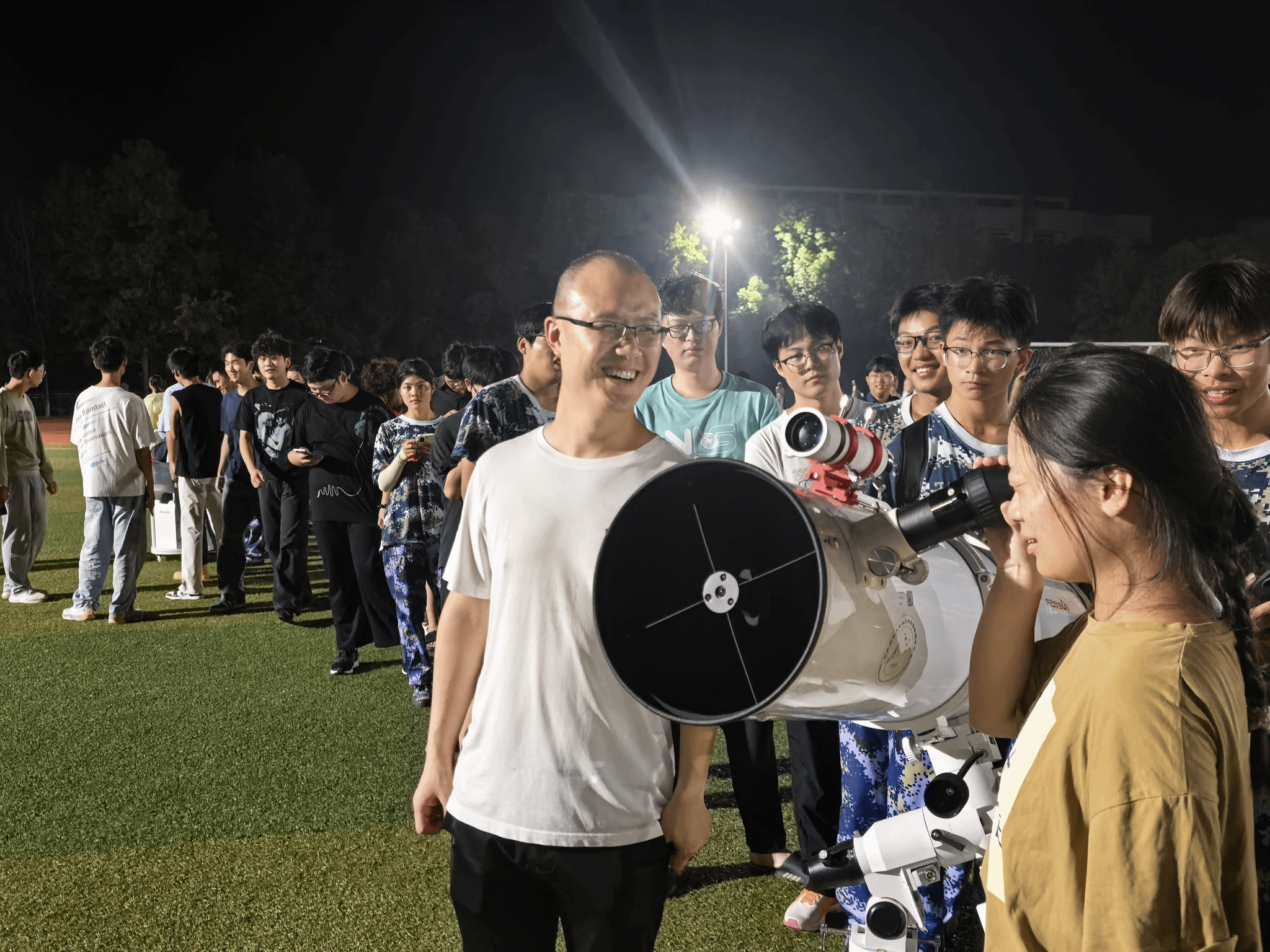 活动现场,新生群体尤为踊跃。许多刚踏入大学校园的同学首次参与如此规模的科普盛会,眼中闪烁着好奇与憧憬。他们围在望远镜旁讨着活动的盛况,更有学生通过视频连线,实时与家人分享这难忘一刻。一句句真挚的告白,不仅传递着节日的喜悦,更承载着对大学生活的美好期待。