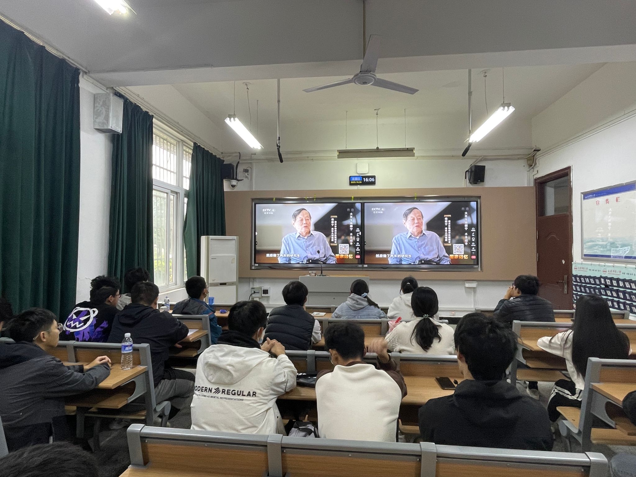 活动开展前,学院在各班级团支部进行广泛动员宣传,鼓励各班级学生集中观看纪录片。随着纪录片的播放,同学们仿佛穿越时空,跟随镜头一步步走进杨振宁先生的世界。他们不仅领略到他在物理学领域所取得的辉煌成就,更感受到他对科学真理那份矢志不渝的追求,以及他与祖国同呼吸、共命运的赤子之心。屏幕之上,那一次次学术探索的历程,那一份份精神坚守的力量,如同涓涓细流,缓缓流入现场每一位学子的心田,令他们深受触动,心潮澎湃。