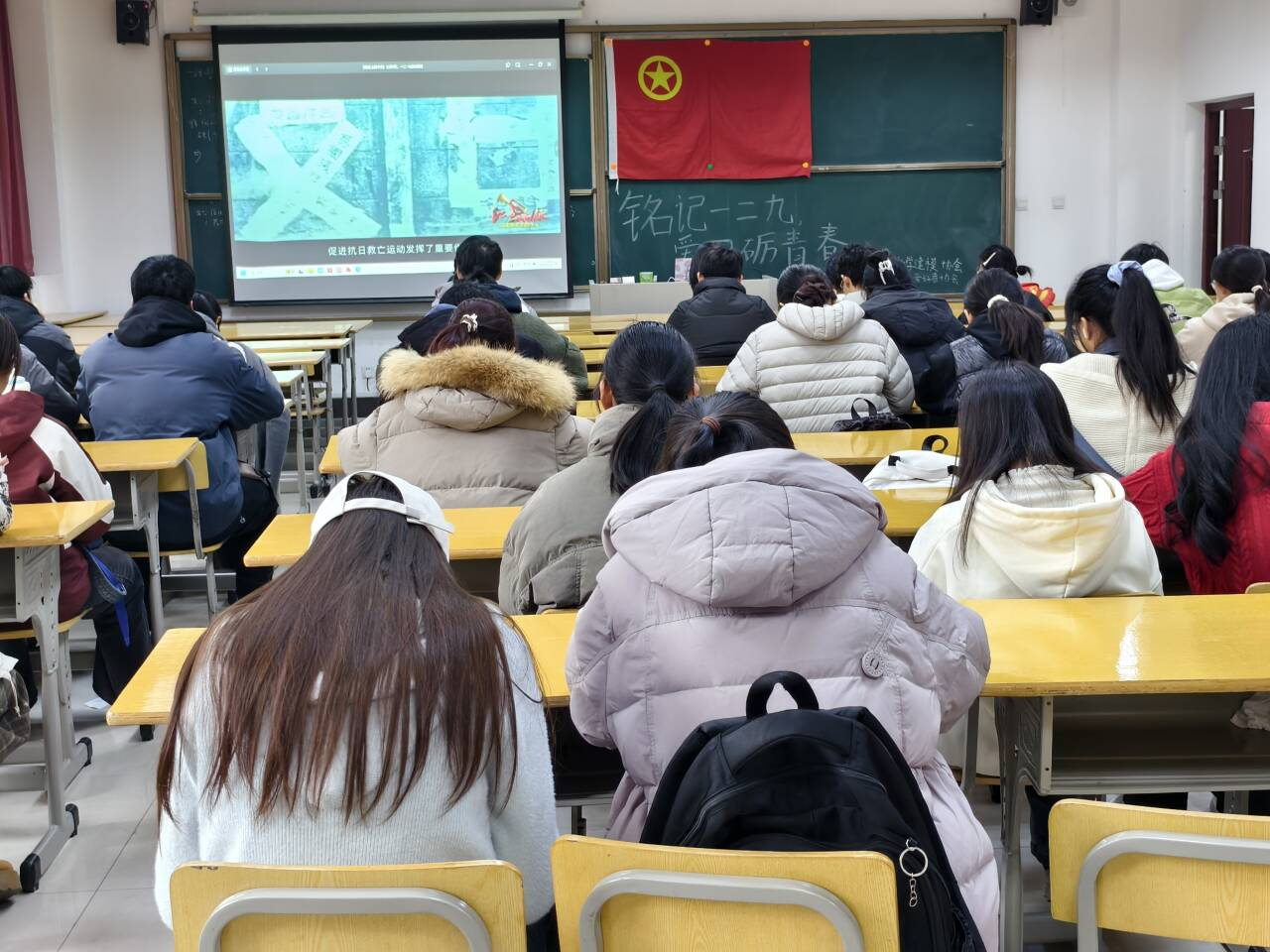 历史回望,影像传情。活动在灯光渐暗的仪式感中拉开序幕。一段精心制作的“一二·九”运动历史短片,将同学们带入那段民族危亡、青年奋起的峥嵘岁月。影片真实再现了爱国学子为救亡图存振臂高呼、不畏强权的英勇壮举。历史的厚重感穿透银幕,深深叩击每一位在场学子的心灵。全场肃穆,同学们凝神观看,眼中闪烁着敬意与深思。