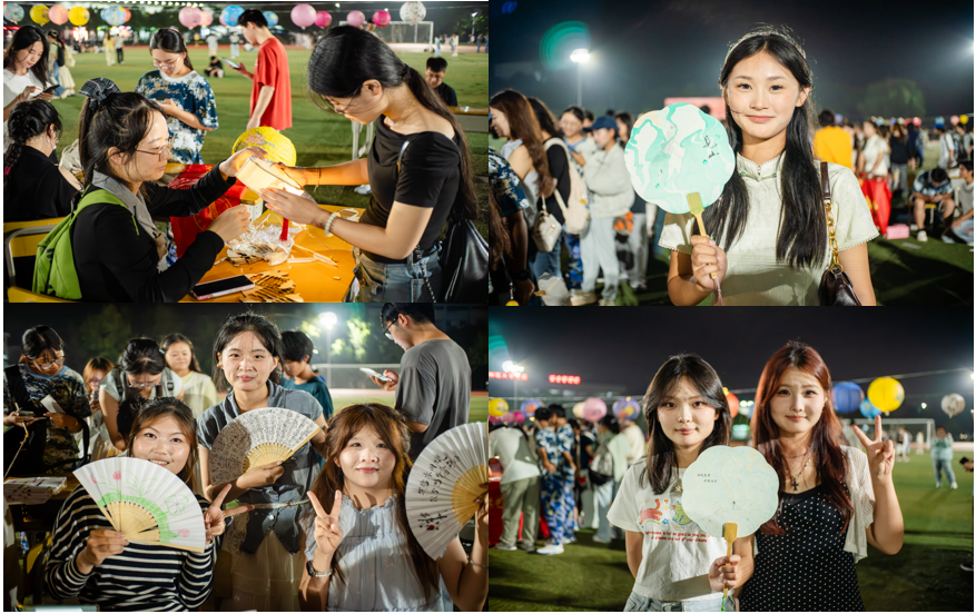 “‘平日不思,中秋想你,有方有圆,甜甜蜜蜜’打一食品!”花灯墙前,职业发展协会的工作人员们读着灯谜,不少学生驻足思考。另一旁的漆扇专区,学生们手持画笔,蘸取颜料勾勒玉兔、月亮、桂花的图案,不时互相交流技巧:“这朵云用淡蓝色,会更加柔和。”“我要在扇子上写下‘但愿人长久’”。欢声笑语间,一把把充满中秋韵味的漆扇渐渐成型。