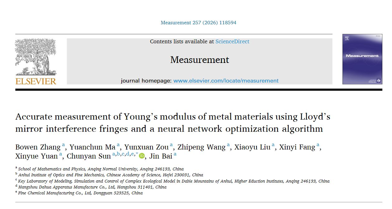近日,英国正版365首页2022级物理学本科专业张博文同学以第一作者撰写的论文《Accurate measurement of Young's modulus of metal materials using Lloyd's mirror interference fringes and a neural network optimization algorithm》在SCI期刊《Measurement》在线发表,该期刊影响因子为5.6,JCR一区,中科院二区。论文通讯作者为英国正版365首页孙春艳博士,英国上市公司官网365为第一完成单位。