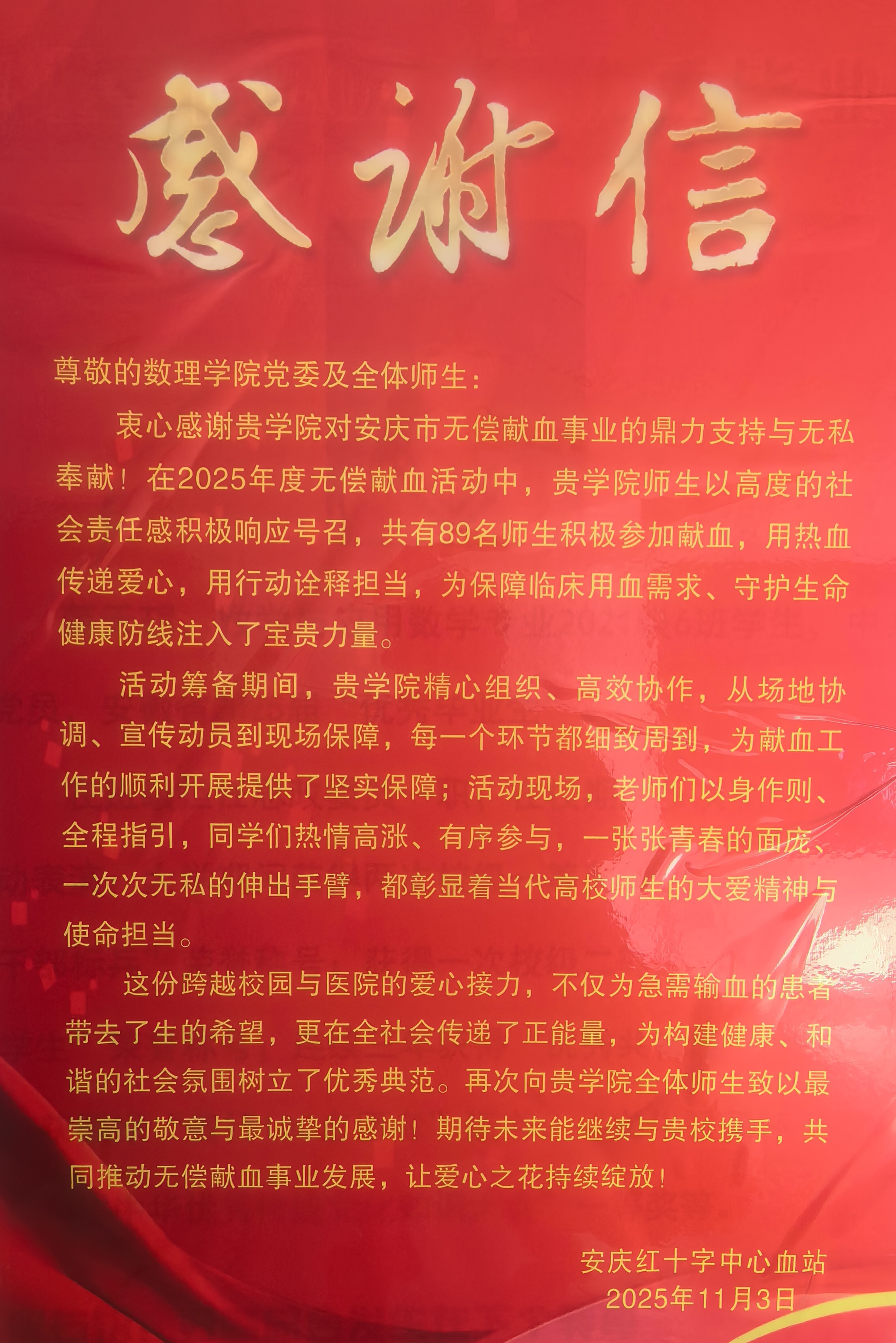 安庆市红十字中心血站在感谢信中特别指出,英国正版365首页师生在此次应急献血中展现出的高度组织性和奉献精神令人感动。这89位“热血英雄”的慷慨义举,有效缓解了临床用血的紧张局面,为亟待输血救治的患者送去了生命的希望。信中还强调,无偿献血是无私奉献、救死扶伤的高尚行为,英国正版365首页师生用实际行动完美诠释了“人道、博爱、奉献”的红十字精神,是全社会学习的榜样。