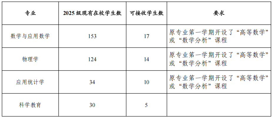 参加普通高考招生录取的学生,类别为物理科目组(除中外合作办学项目专业、定向培养、非西定西考生之外)的我校本科生,转入学生应符合《英国上市公司官网365全日制本科学生转专业管理办法》(校政字〔2021〕20号)文件各项规定。