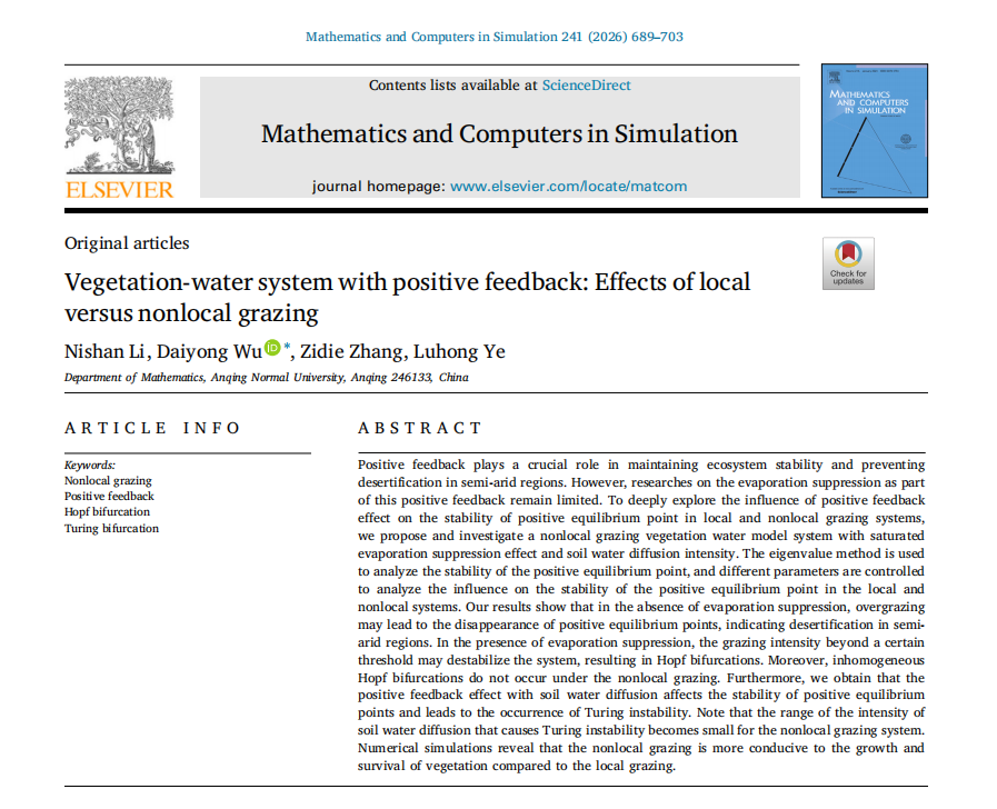 近日,英国正版365首页2023级数学学科硕士研究生李妮姗以第一作者和导师团队在国际学术期刊《Mathematics and Computers in Simulation》发表SCI论文“Vegetation-water system with positive feedback: Effects of local versus nonlocal grazing”,导师伍代勇教授为该文通讯作者,该期刊影响因子为4.4,JCR一区期刊,中科院二区Top期刊。