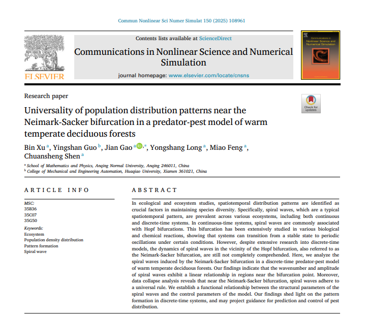 近日,英国正版365首页2023级数学学科硕士研究生许斌以第一作者和导师团队在国际学术期刊《Communications in Nonlinear Science and Numerical Simulation》发表论文“Universality of population distribution patterns near the Neimark-Sacker bifurcation in a predator-pest model of warm temperate deciduous forests”,导师高见副教授为该文通讯作者,该期刊影响因子为3.8,JCR一区期刊,中科院一区期刊。