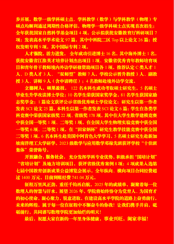 英国正版365首页系统回顾了2025年在党建引领、教学科研、师资建设、人才培养、社会服务等方面取得的丰硕成果:党建品牌持续夯实,专业与课程建设跻身国家级序列,科研创新能级稳步提升,师资结构不断优化,学子在升学深造、学科竞赛、国际交流中捷报频传……这些成绩,生动刻画出数理人脚踏实地、锐意进取的精神风貌。