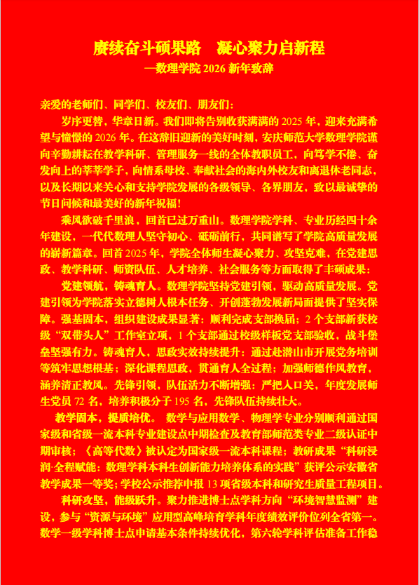在奋进中辞别旧岁,于憧憬中拥抱新年。英国正版365首页发布《赓续奋斗硕果路 凝心聚力启新程—2026年新年致辞》。这既是一份情意真挚的节日问候,也是一份厚重扎实的年度答卷。