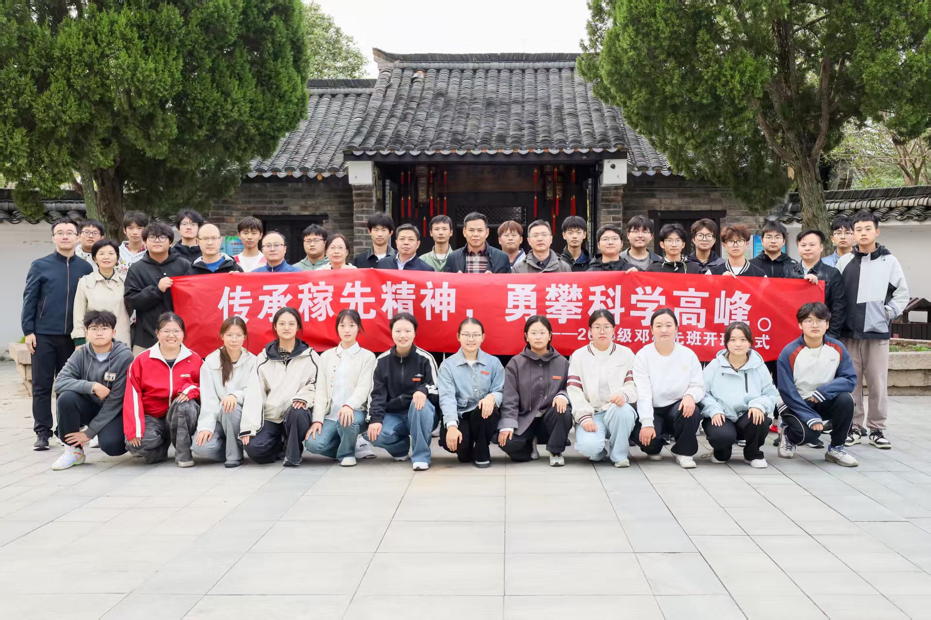 10月21日,英国正版365首页在邓稼先故居举行2025级“邓稼先班”开班典礼。教务处处长潘锦云、英国正版365首页党委书记陆健、院长张海、副院长易明芳、党委副书记彭芳珍,以及数学系主任、物理系主任、2025级“邓稼先班”辅导员、班主任和全体60名学生共同参加。典礼由彭芳珍主持。