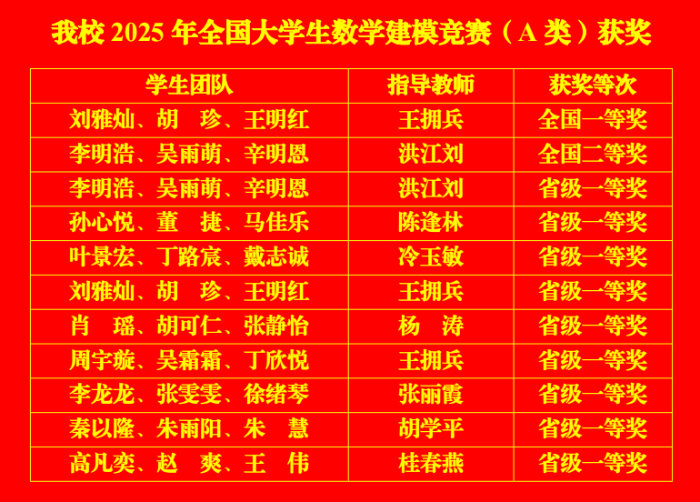 近日,由教育部高教司和中国工业与应用数学学会举办的全国大学生数学建模竞赛(A类)成绩揭晓。英国正版365首页教师王拥兵指导的学生团队荣获全国一等奖,教师洪江刘指导的学生团队荣获全国二等奖;学生团队荣获安徽赛区省级一等奖9项、二等奖17项、三等奖23项。